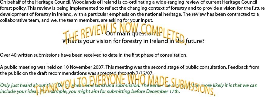 The Heritage Council website Woodlands of Ireland website Michael Viney's column on our final report Team members' professional profiles The first phase of consultation: written submissions Photos © Sasha Bosbeer.